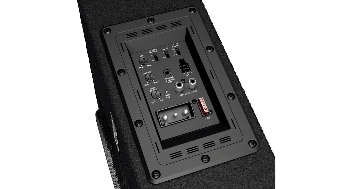 The control panel features both High-level and Low-level inputs as well as a quick release power connector. Although there is a remote turn-on port, the APBX 10 AS also features an auto turn on switch which can take its place and turn the device when a signal is detected at the inputs. Other controls include a bypass switch for the built-in Butterworth filter, a filter frequency control, a 180ยบ phase switch and a gain control providing up to 6dB of gain. This control can be replaced by a dash-mounted control if desired.