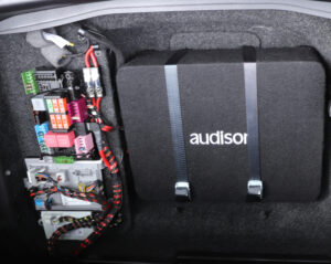The above is a picture of an APBX 10 AS mounted in the spare wheel well of a Mercedes C-class. This neat under floor application requires your FOUR MASTER to move the fuses and relays you can see from the bottom of the wheel well, as you can see here. Everything sits neatly below the normal bot floor ensuring luggage space is not compromised. The performance of the subwoofer is not affected at all. You can read a Driving Sounds article on this particular installation here: https://www.drivingsounds.co.uk/articles/archive/issue-9/mercedes-flies-to-the-moon