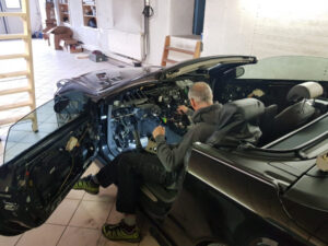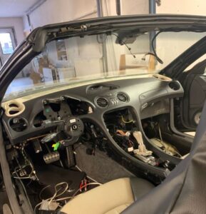 One of the scariest things to see, is a supercar being striped out. In this installation, Steven wanted to put the mid and high frequency speakers on axis up on the dashboard. The original factory positions were discounted as being unsuitable. Steven went to work to design and build a major dashboard modification.