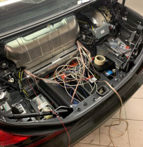 In this car, all the clever wiring happens in the rear luggage compartment. Here it is with the amp rack and electronics in place and all wires run ready for cutting to length and terminating. Looks like a scary mess doesn’t it?