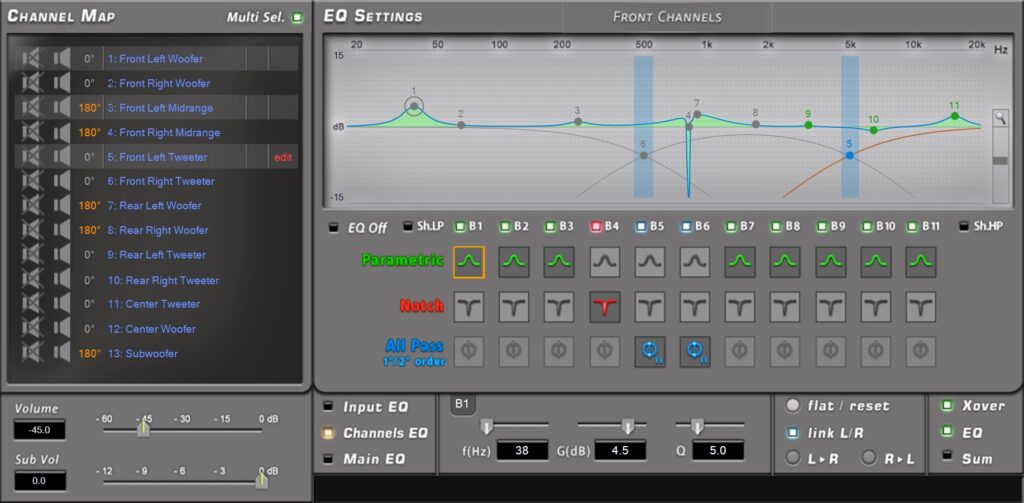 The plot shows that they have removed all mid-range frequencies and boosted the high and low frequencies to ridiculous levels. Sadly, this ploy didn’t work, and it sounded shocking. Once a new Prima system had been installed, the first part of the setting up process was to make that curve as flat as possible. This is not because a flat frequency response is necessarily the best thing, but it is a great starting point. All Audison bit processors can flatten the curve with a mere press of the right buttons as the process is more or less automated. The trick is, knowing where these buttons are and having a suitable microphone array in the vehicle, so the processor can “hear” what it is doing.