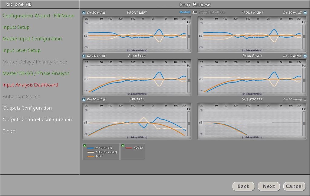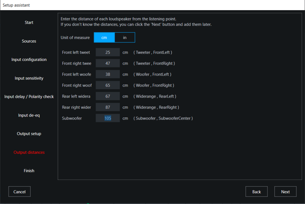 The screenshot above shows the page where speaker distances are input. This is the distance between each speaker and the listener’s ears. This helps the bit drive device add delays so that the sound from each speaker arrives at the ears simultaneously.