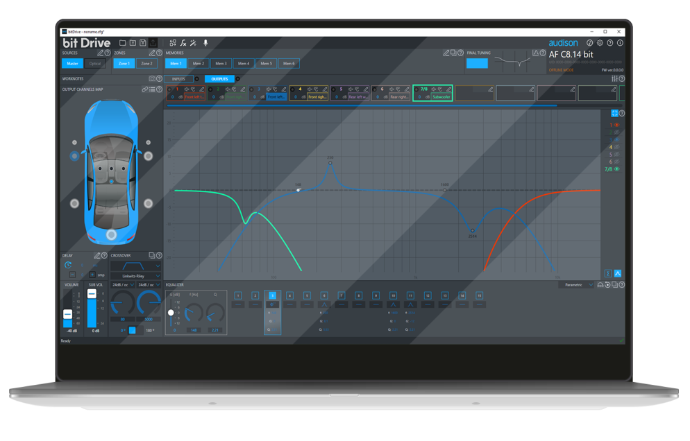 bit Drive, the overarching name for Audison bit-equipped devices, is a particularly clever software package which gives access to myriad functions and features to make a car’s audio system sound spectacular. DSP (Digital Signal Processing) is commonplace in vehicles these days. Many have some form of DSP technology on board. These carry heavily modified sound curves to make cheap speakers used in the manufacture of cars sound almost palatable and protect them from damage when the audio system is turned up.